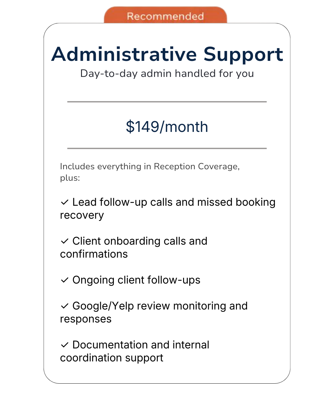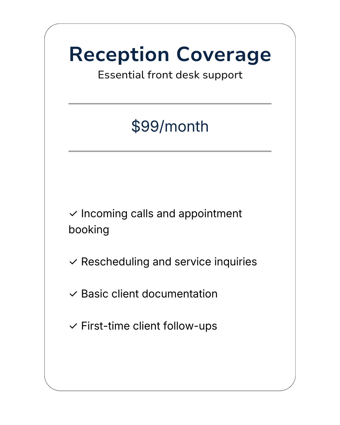 This is a real receptionist who understands your services, pricing, and clientele — handling calls and bookings with the same care as an in-house front desk.