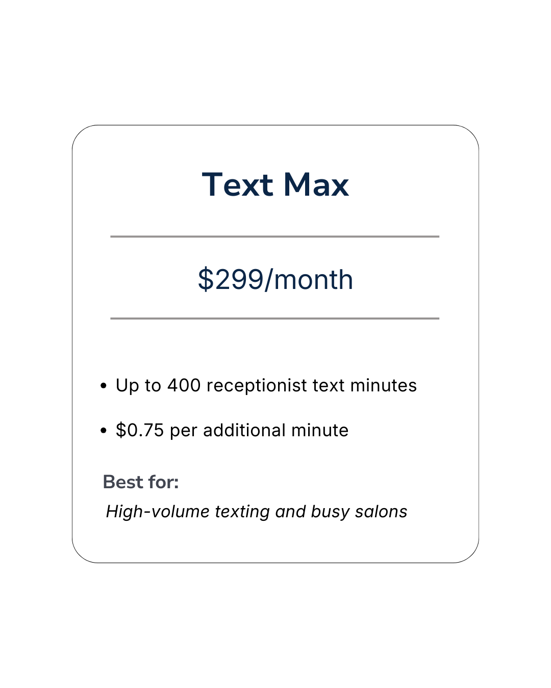 $275 one-time onboarding fee Includes receptionist training, system setup, and salon-specific workflow alignment.